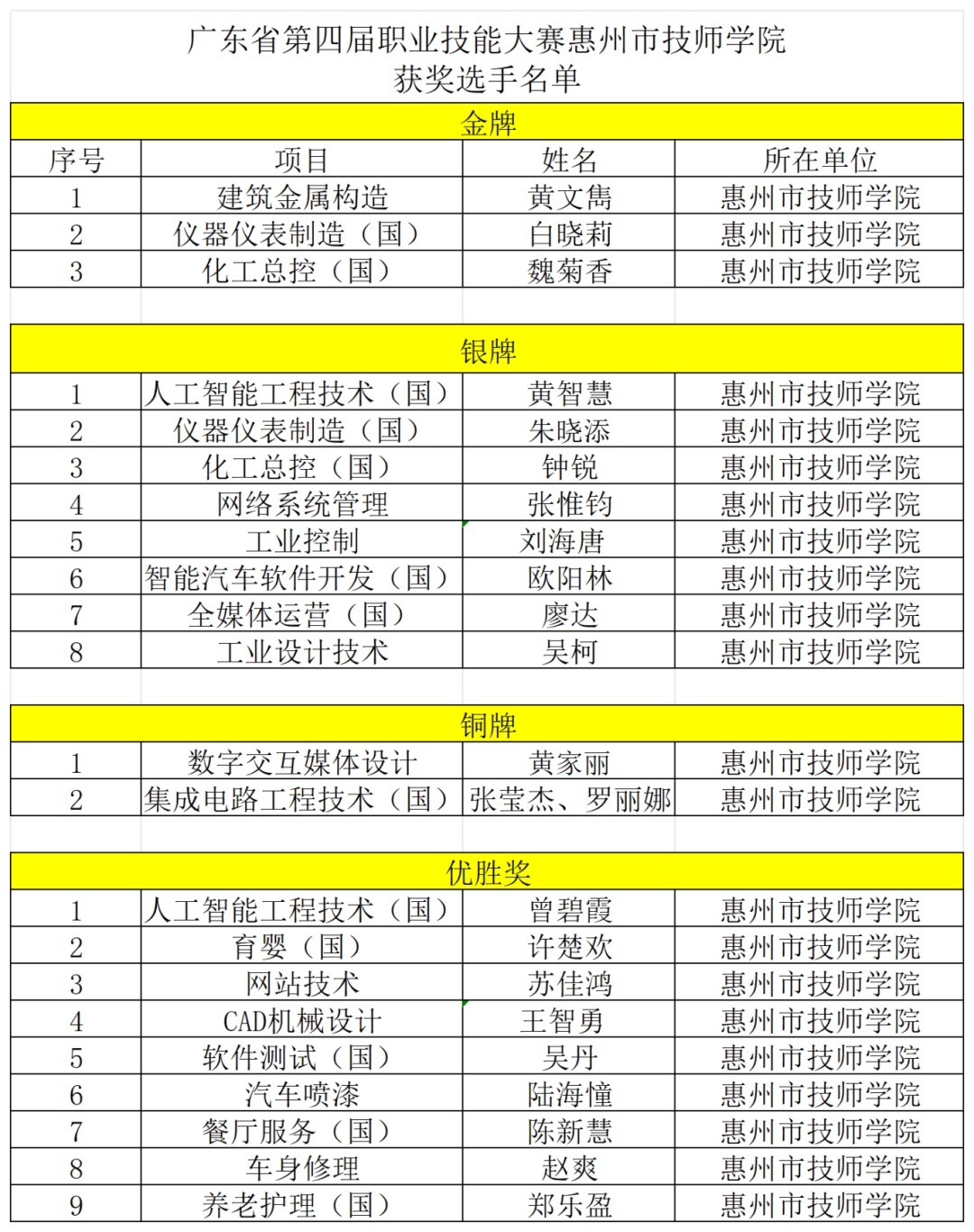 6月6日晚,广东省第四届职业技能大赛在广州圆满闭幕。惠州市技师学院在本届大赛中表现突出,共获得3枚金牌、8枚银牌、2枚铜牌和9个优胜奖,奖牌数位居全省参赛单位前列,充分展现了学院在技能人才培养领域的深厚底蕴与创新实力。这份沉甸甸的荣誉背后,凝聚着学院长期以来坚持"产教融合、以赛促教、以赛促学"教育理念的不懈努力。